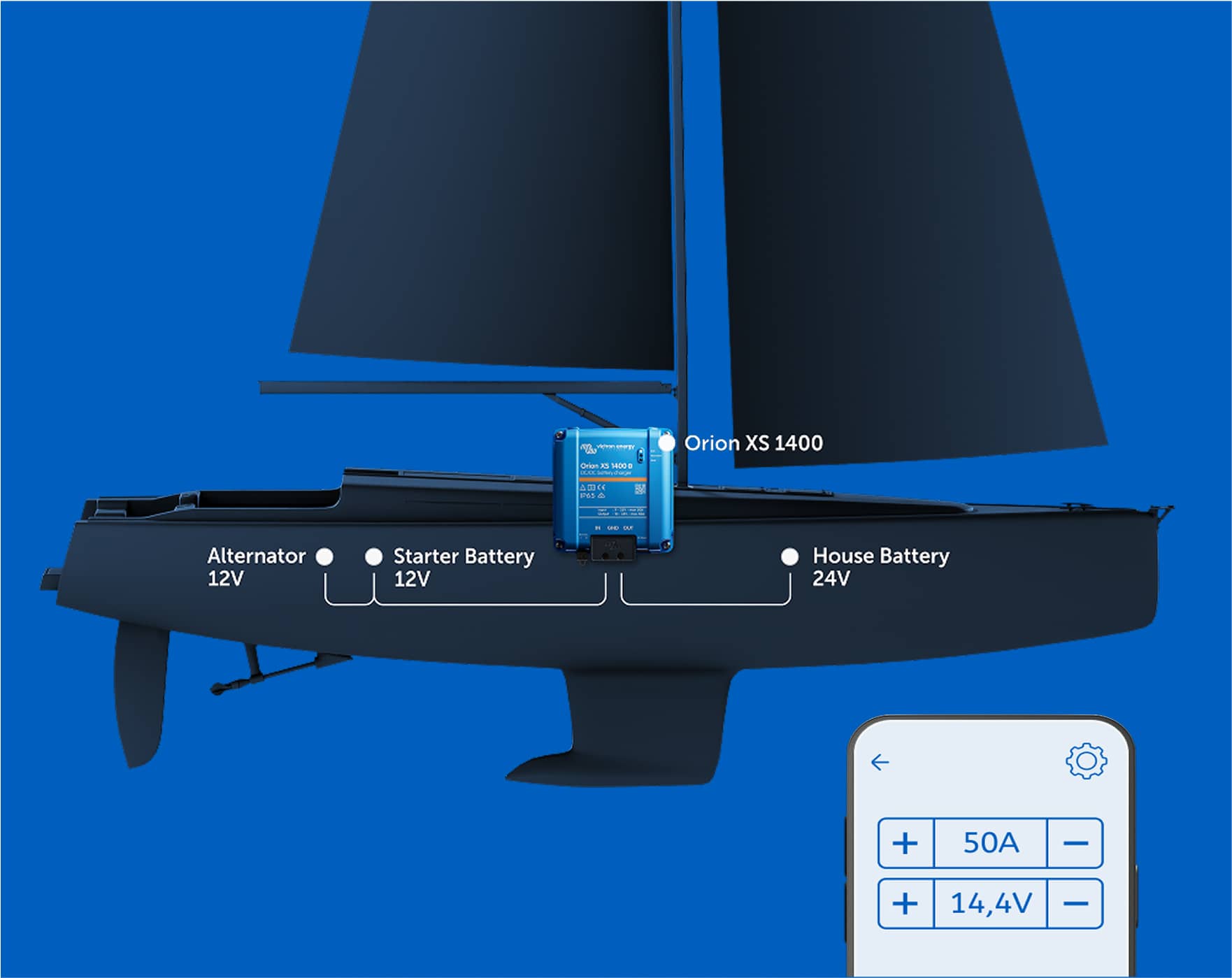 Der Eingangsstrom kann präzise begrenzt werden, um eine Überlastung der Lichtmaschine zu verhindern. Die Ladespannung ist vollständig konfigurierbar, um Lithium-, AGM-, Gel- und andere Batteriechemien anzupassen. Für Mischspannungssysteme bietet der Orion XS 1400 auch eine 12-V-zu-24-V- oder 24-V-zu-12-V-Wandlung.